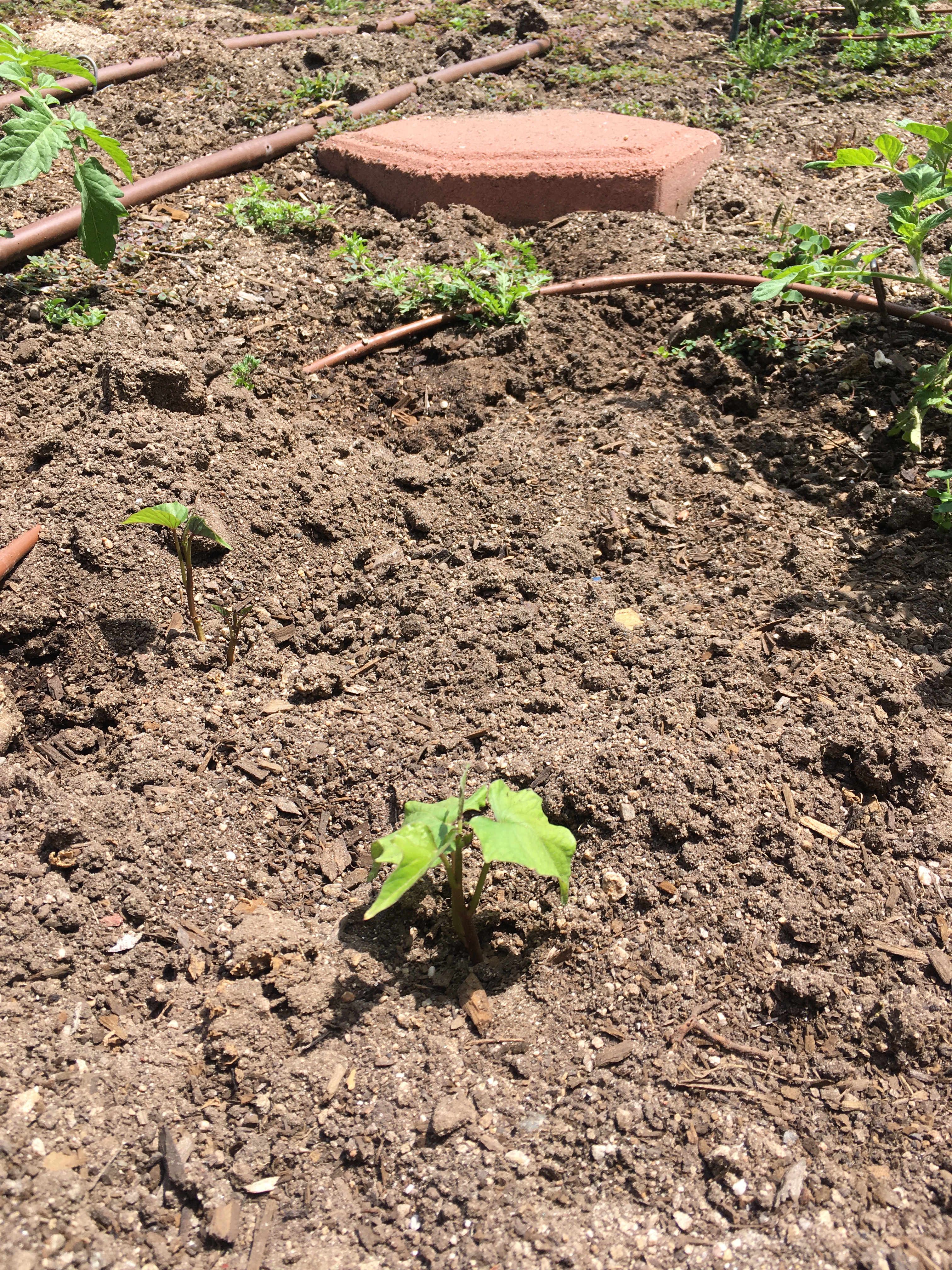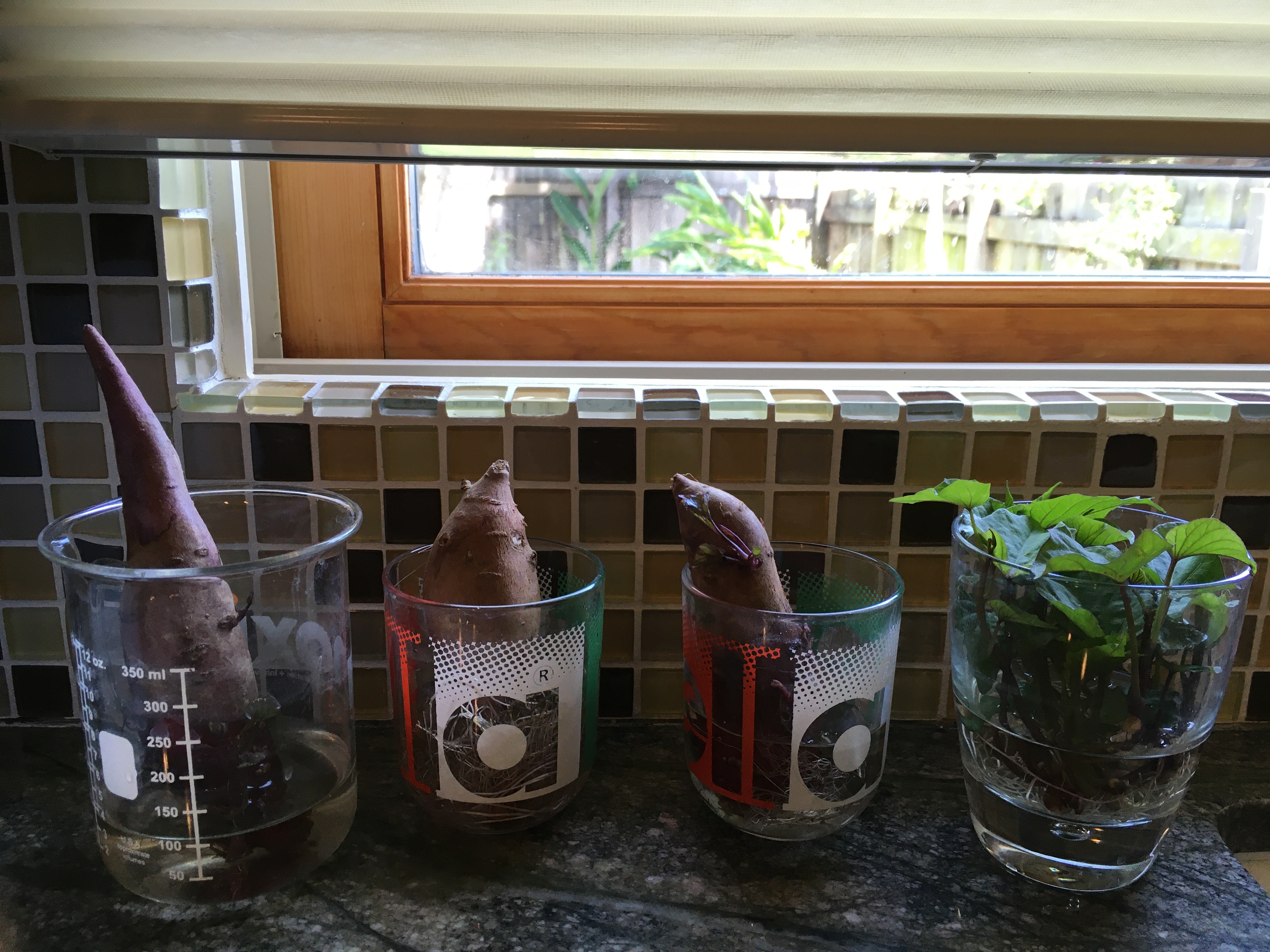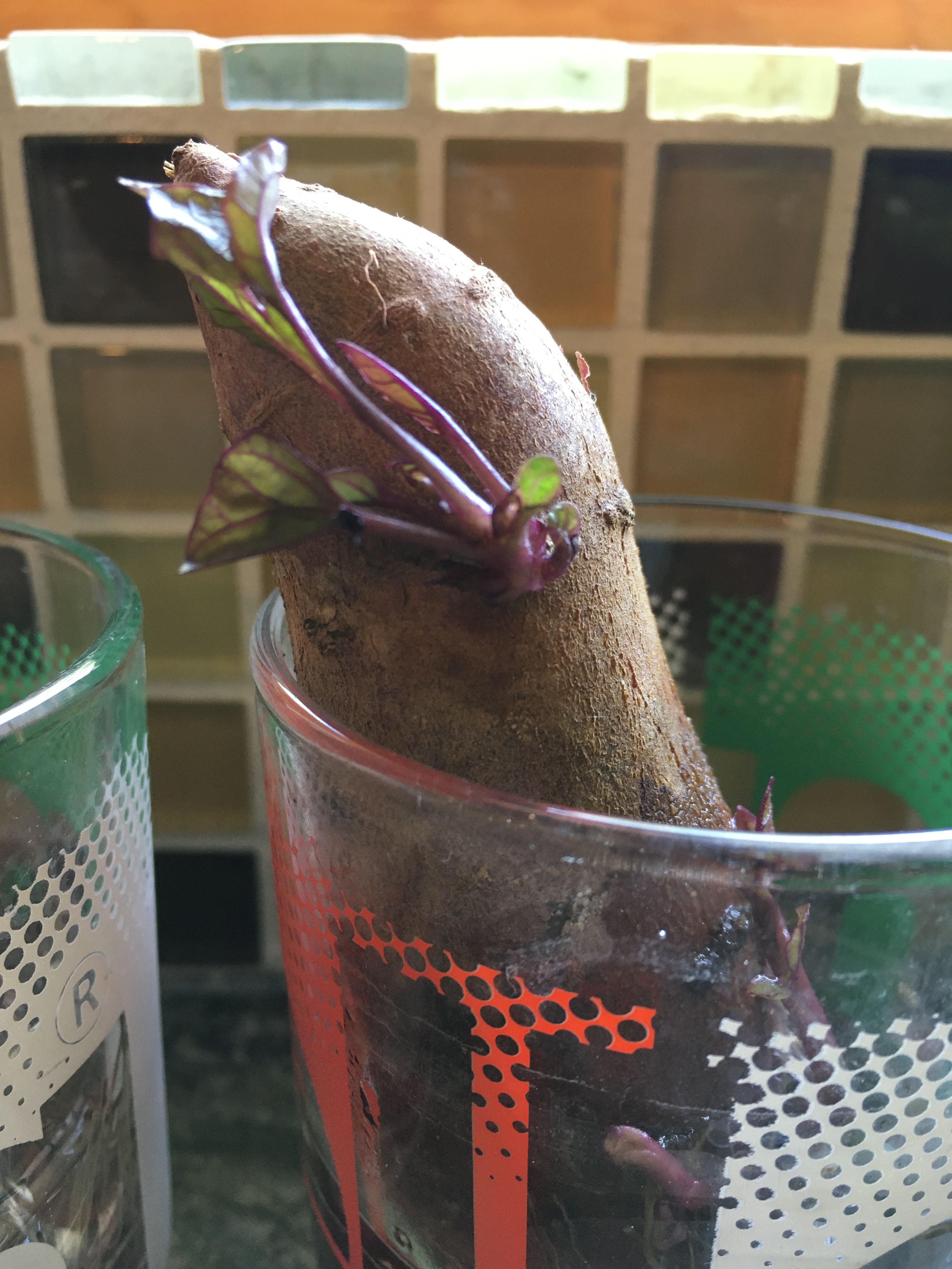 The sweet potato is a little different. I put little sweet potatoes in glasses of water and waited for they eyes to sprout slips — little green stems and leaves. Then I planted the slips in the ground. I’ve been doing this for about three weeks, and there seems to be no end to the slips growing on the sweet potatoes. I’m super excited to see what grows in my garden!